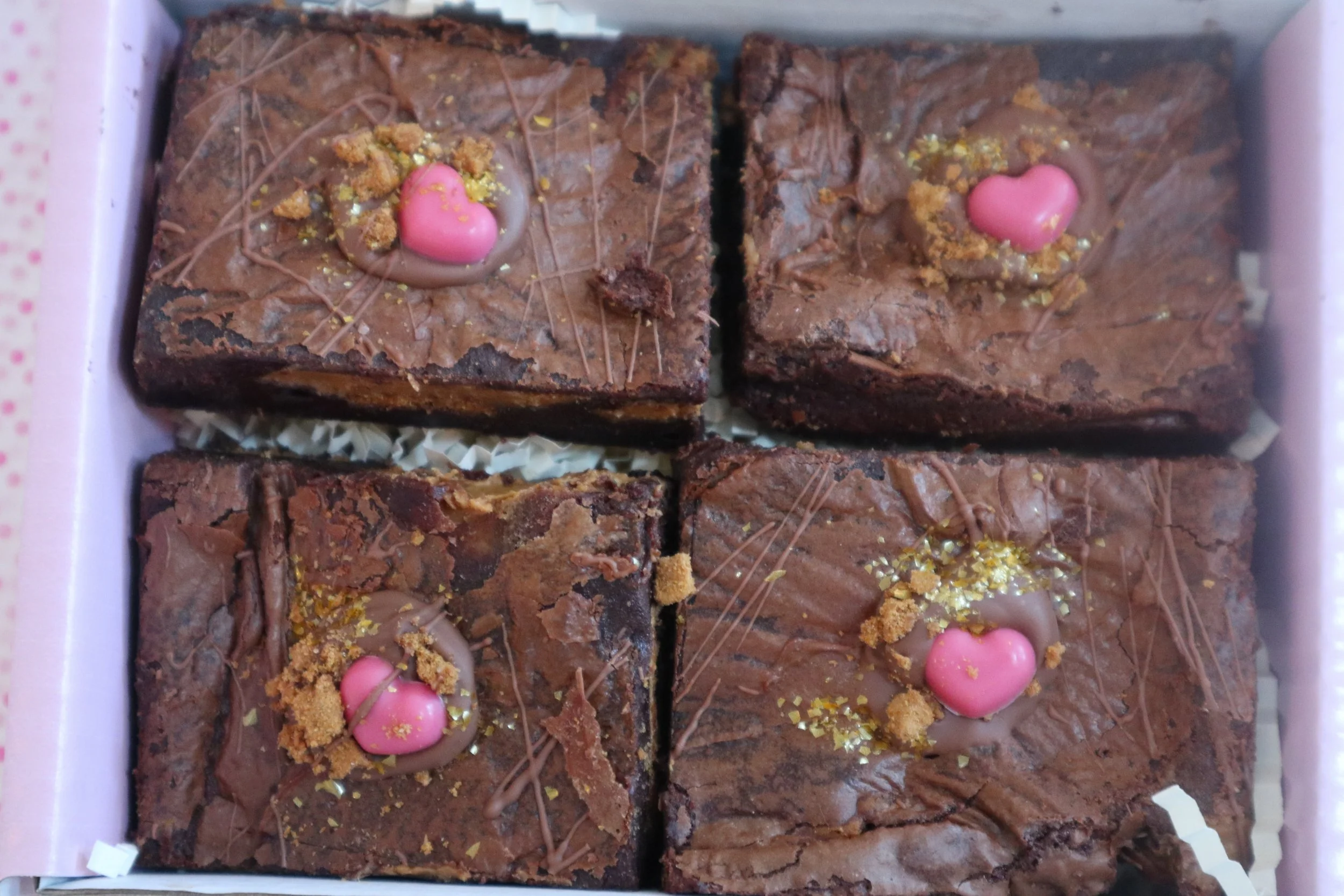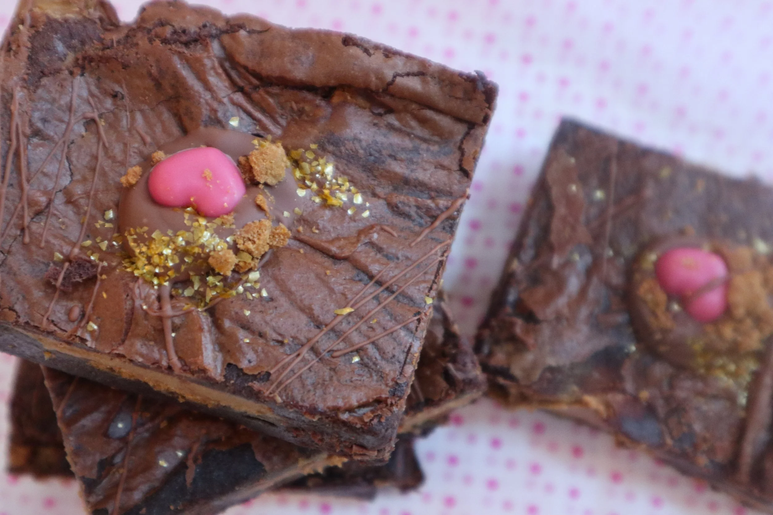 Glazed with dark chocolate and more crushed biscoff biscuits and decorated with a pink-white chocolate heart & gold sprinkles.